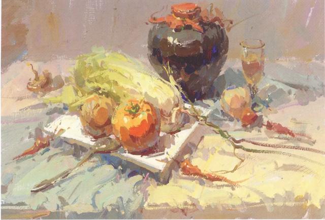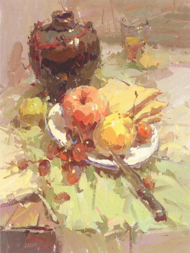 这是对客观色彩进行梳理、提炼的过程。作画时通过对色彩色相、明度、纯度、冷暖四个关系的对比,把握其中的关系,捕捉主要的色彩倾向,强调写生对象的固有色,合并同类色。
