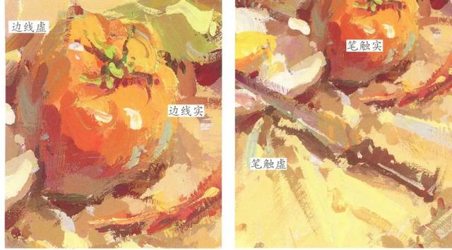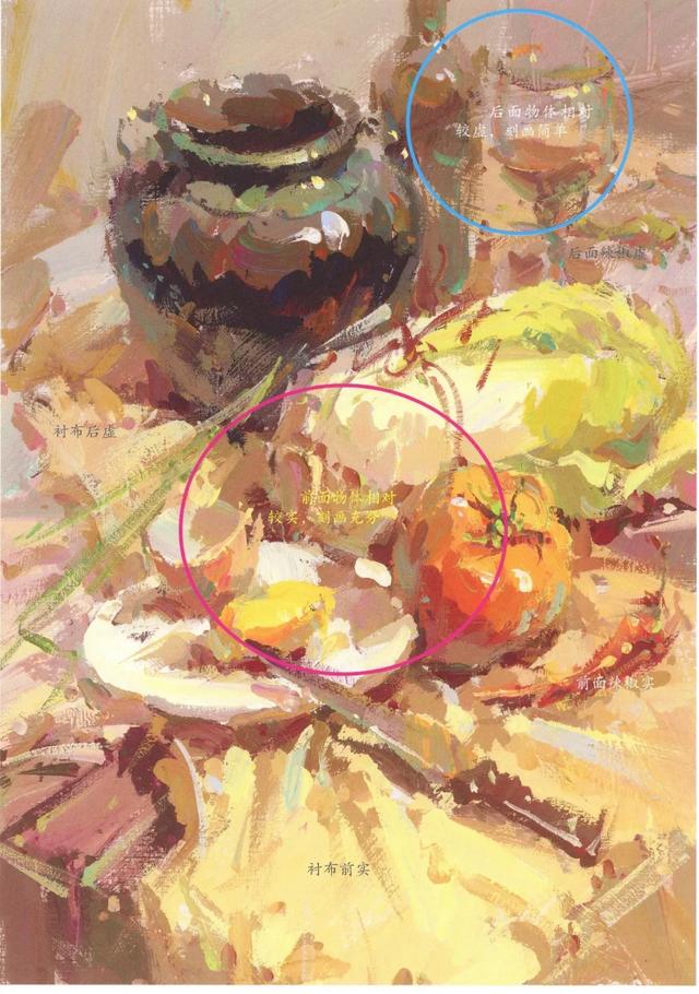 放到空间画面来看,背景与桌面的笔触相对较“整”,物体与衬布的笔触则相对较“碎”。把握好画面的节奏,才能将空间感更好地表现出来。