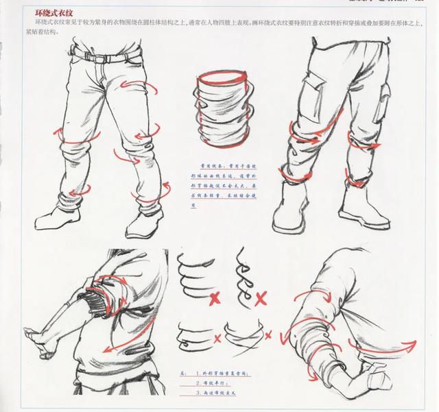 环绕式衣纹常见于较为紧身的衣物围绕在圆柱体结构之上,通常在人物四肢上表现。画环绕式衣纹要特别注意衣纹转折和穿插或叠加要附在形体之上,紧贴着结构。