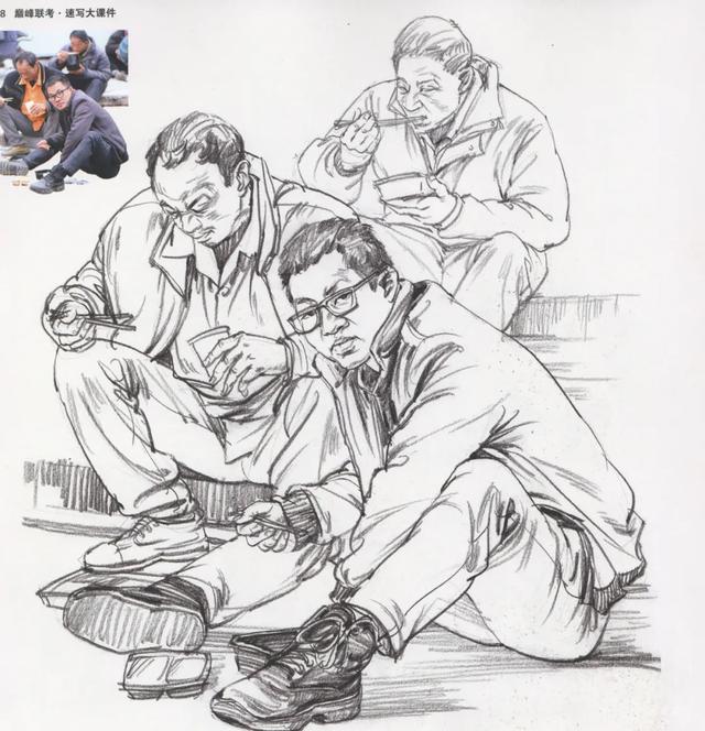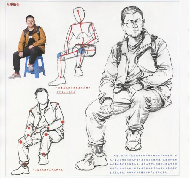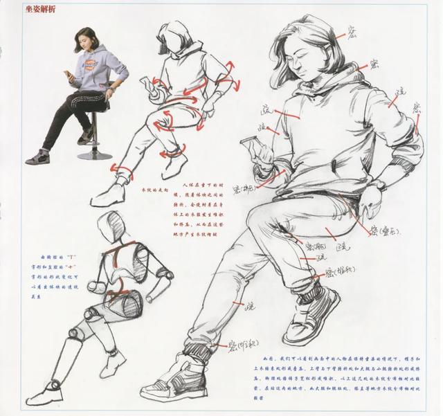 人体在坐下的时候,随着体块之间的转折,会使附着在身体上的衣服发生堆积和挤压,从而在这些地方产生衣纹褶皱。