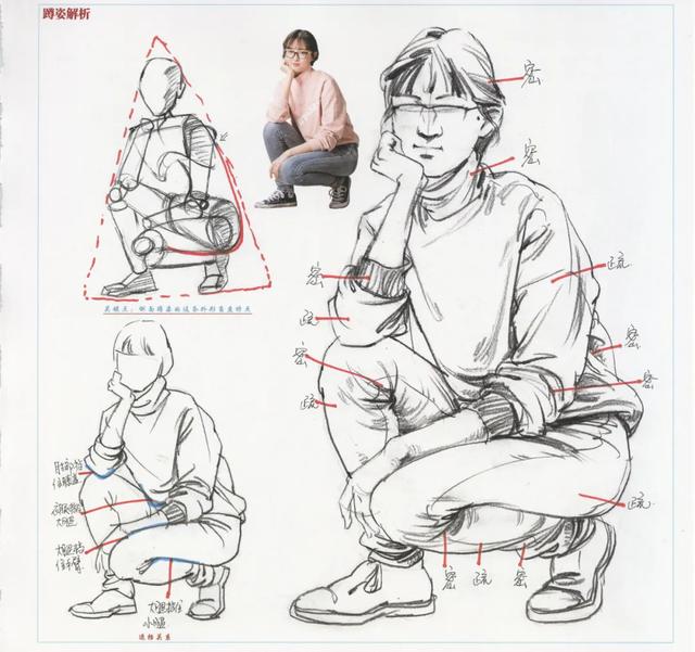 如图,我们可以看到画面中的人物在保持坐姿的情况下,帽子和上衣结束处形成叠压,上臂与下臂转折处和大腿与小腿转折处形成挤压,脚踝处因裤子宽松形成堆积,以上这几处的衣纹分布相对比较密。在贴近肉的地方,如大腿和腿肚处、膝盖等地方衣纹分布相对比较密。