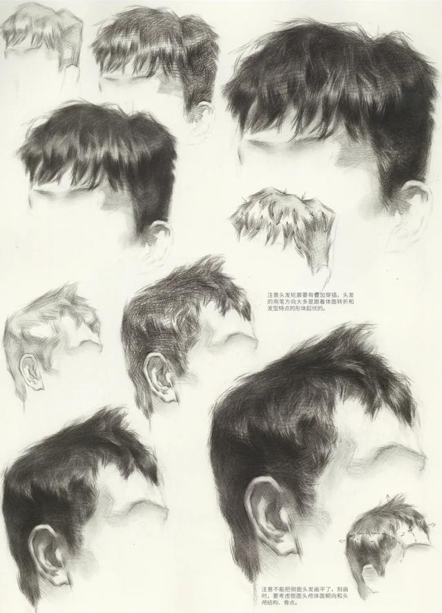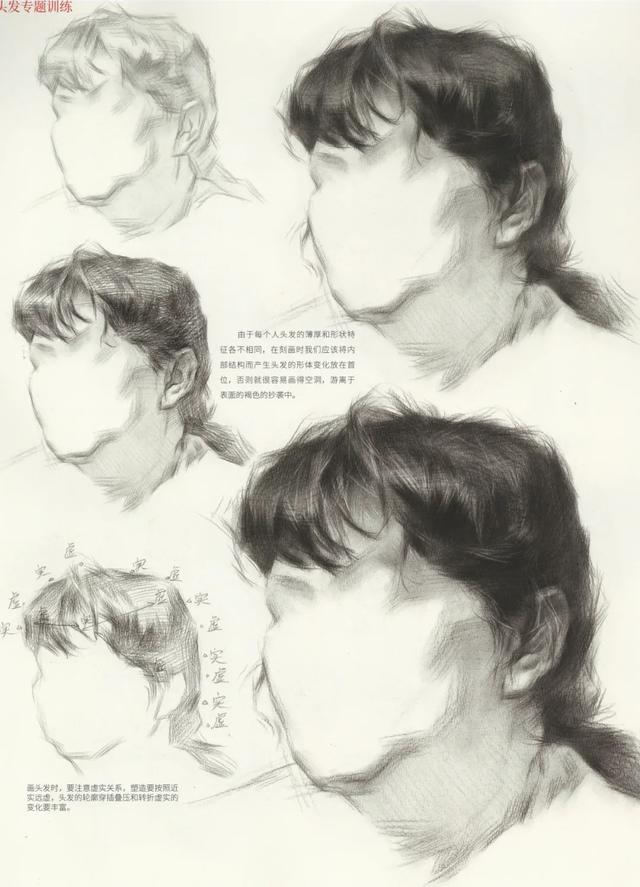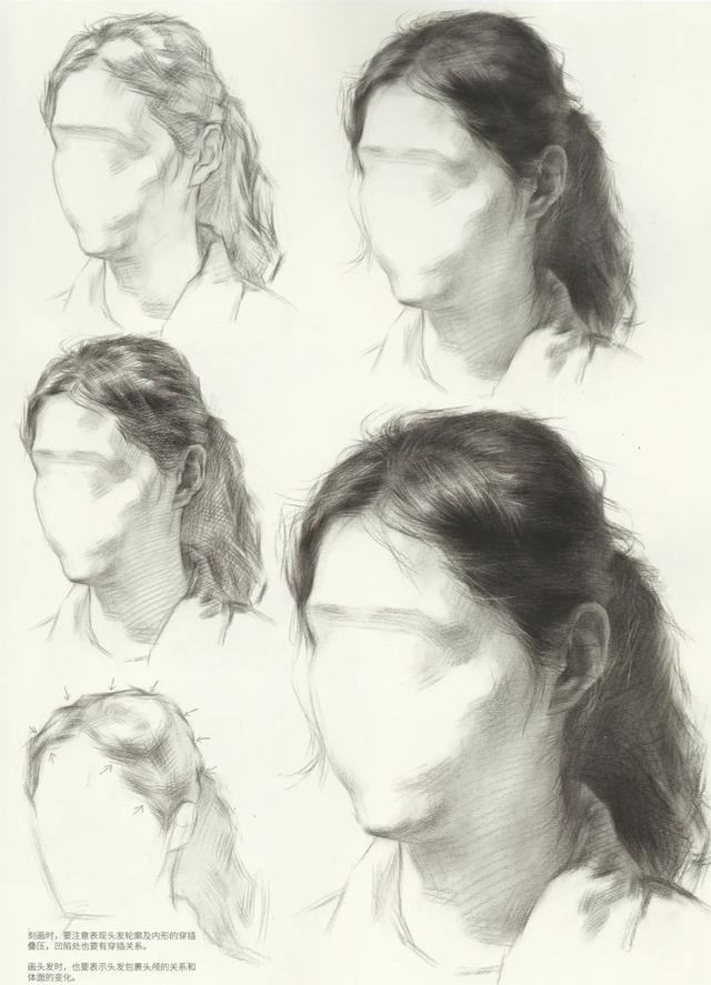 刻画时,要注意表现头发轮廓及内形的穿插叠压,凹陷处也要有穿插关系。画头发时,也要表示头发包裹头颅的关系和体面的变化。