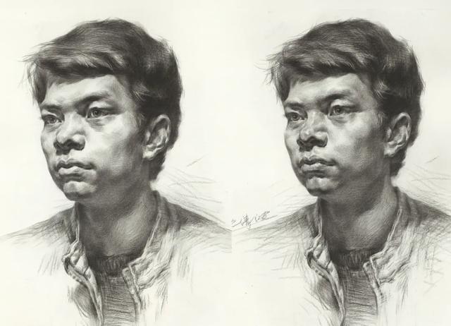 画头发时,要注意虚实关系,塑造要按照近实远虚,头发的轮廓穿插叠压和转折虚实的变化要丰富。