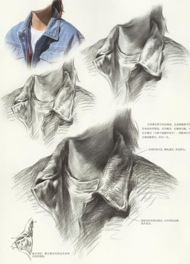 衣服中间实,两边虚,刻画时,适当强化对比。要注意衣服与脖子的穿插关系